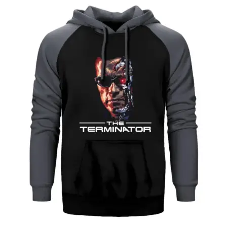 • Terminator Arnold Schwarzenegger Hoodie, Double Color Raglan Sleeve Gray Sweatshirt