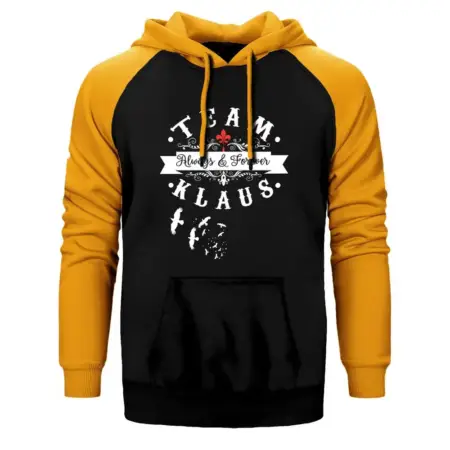• Team Klaus Hoodie, Double Color Raglan Sleeve Yellow Sweatshirt