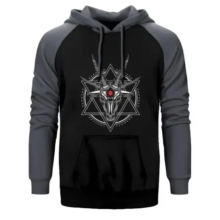• Baphomet Goat Head Hoodie, Double Color Raglan Sleeve Grey Sweatshirt