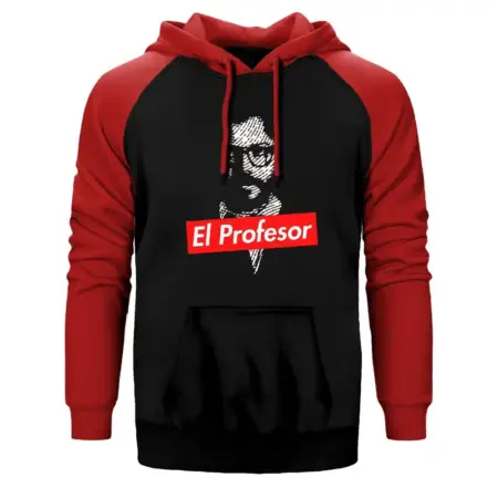 • La Casa De Papel Professor Double Color Raglan Sleeve Red Hoodie Sweatshirt
