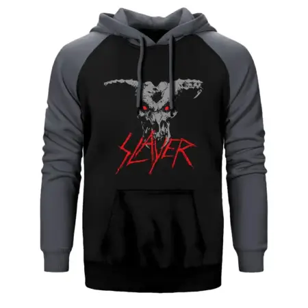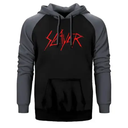 • Slayer Logo Hoodie, Double Color Raglan Sleeve Gray Sweatshirt