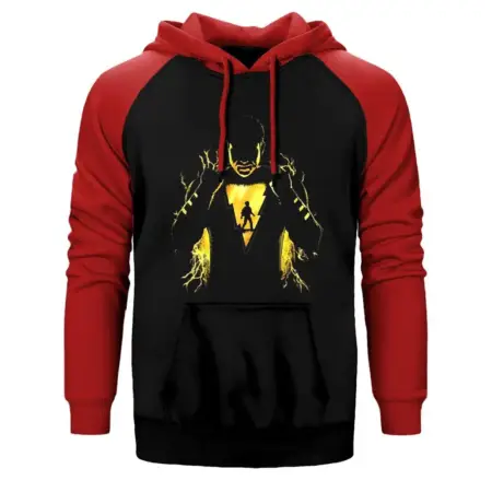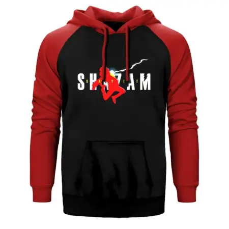 • Shazam Logo Hoodie, Double Color Raglan Sleeve Red Sweatshirt