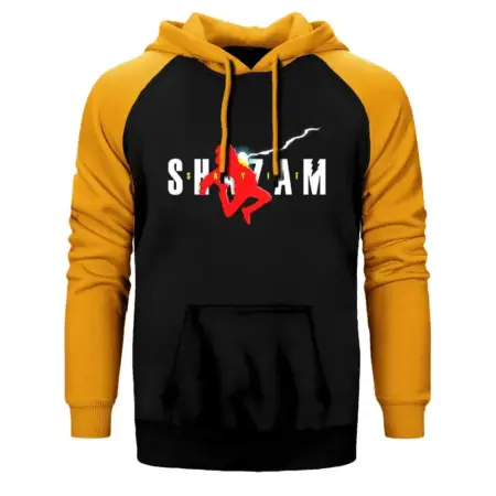 • Shazam Logo Hoodie, Double Color Raglan Sleeve Yellow Sweatshirt