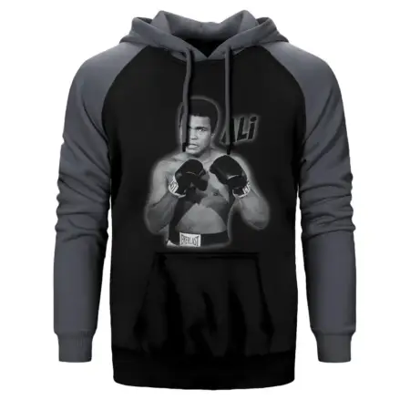 • Muhammad Ali Poster Hoodie, Double Color Raglan Sleeve Gray Sweatshirt