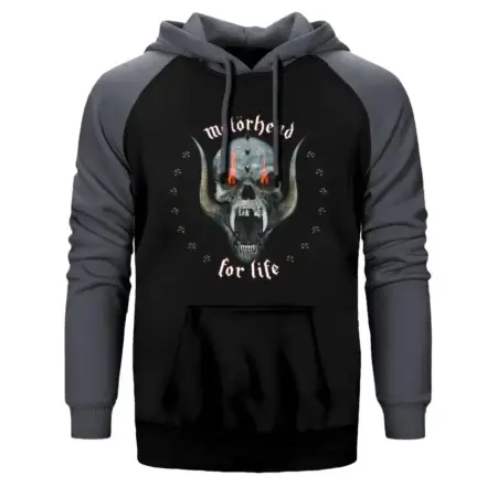 • Motörhead Skull For Life Hoodie, Double Color Raglan Sleeve Gray Sweatshirt