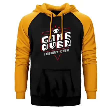 • Game Over Insert Coin Hoodie, Double Color Raglan Sleeve Yellow Sweatshirt
