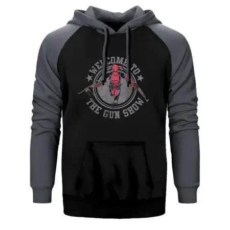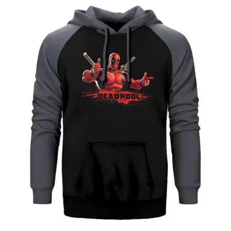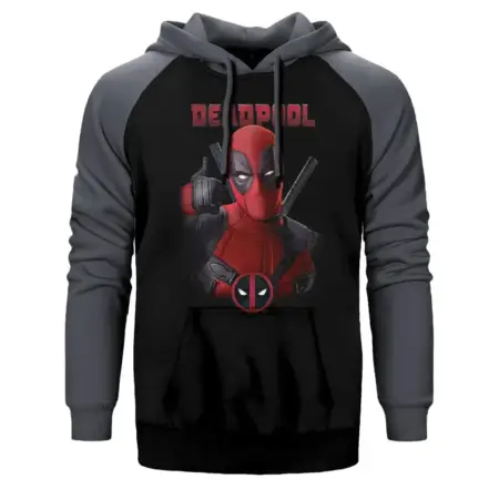 • Deadpool Gun Show Hoodie, Double Color Raglan Sleeve Gray Sweatshirt