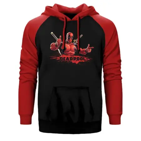 • Deadpool Gun Show Hoodie, Double Color Raglan Sleeve Red Sweatshirt