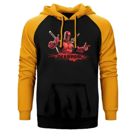 • Deadpool Gun Show Hoodie, Double Color Raglan Sleeve Yellow Sweatshirt