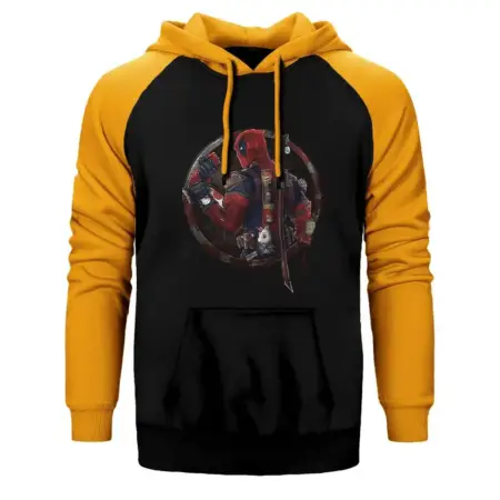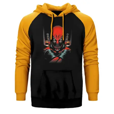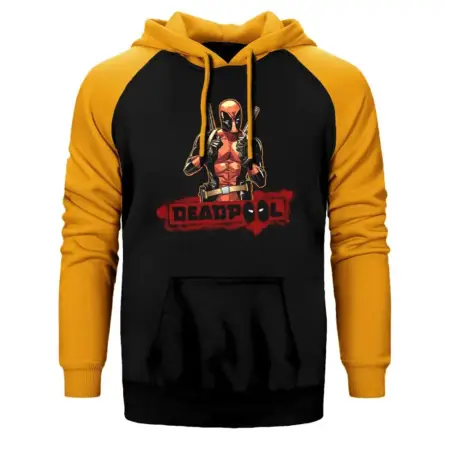 • Deadpool Dual Sword Hoodie, Double Color Raglan Sleeve Yellow Sweatshirt