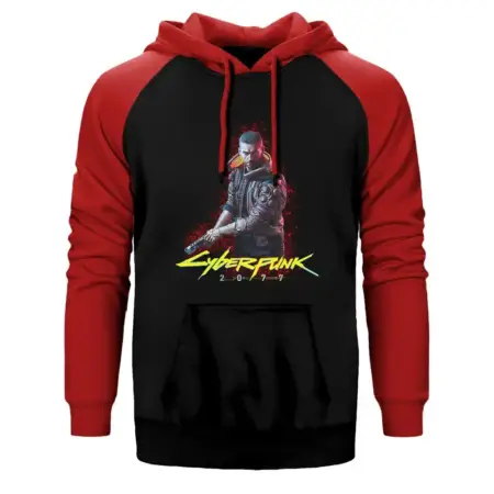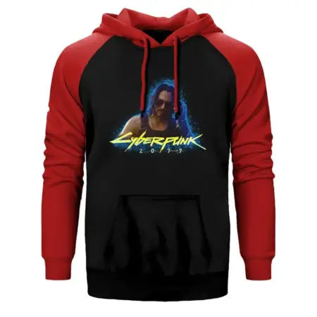 • Cyberpunk 2077 Keanu Reeves Hoodie, Double Color Raglan Sleeve Red Sweatshirt
