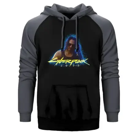 • Cyberpunk 2077 Keanu Reeves Hoodie, Double Color Raglan Sleeve Grey Sweatshirt