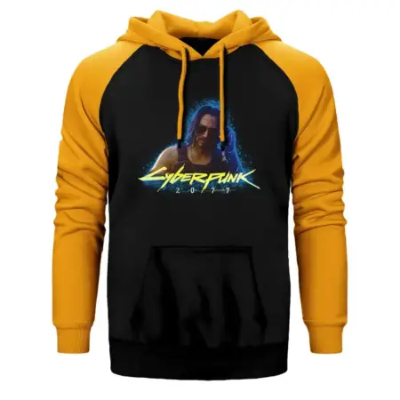 • Cyberpunk 2077 Keanu Reeves Hoodie, Double Color Raglan Sleeve Yellow Sweatshirt