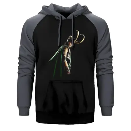 • Horned Loki Hoodie, Double Color Raglan Sleeve Gray Sweatshirt