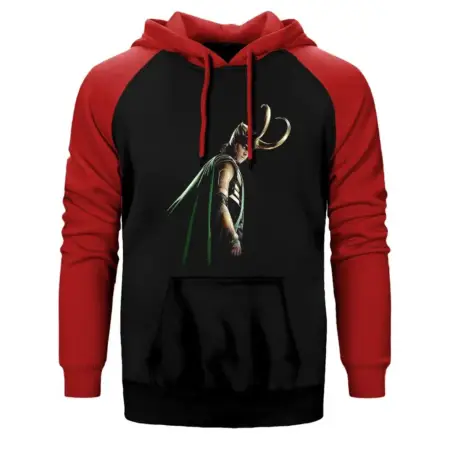 • Horned Loki Hoodie, Double Color Raglan Sleeve Red Sweatshirt