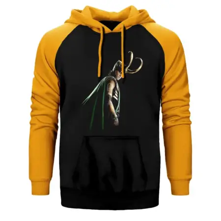 • Horned Loki Hoodie, Double Color Raglan Sleeve Yellow Sweatshirt