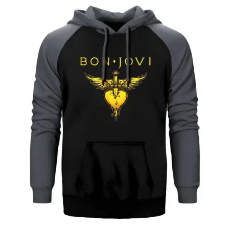 • Bon Jovi Gold Hearth Hoodie, Double Color Raglan Sleeve Grey Sweatshirt
