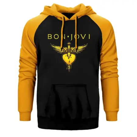 • Bon Jovi Hearth Hoodie, Double Color Raglan Sleeve Yellow Sweatshirt