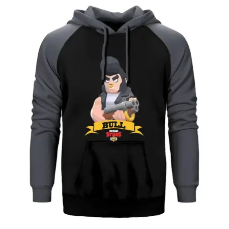 • Brawl Stars Bull Hoodie, Double Color Raglan Sleeve Grey Sweatshirt