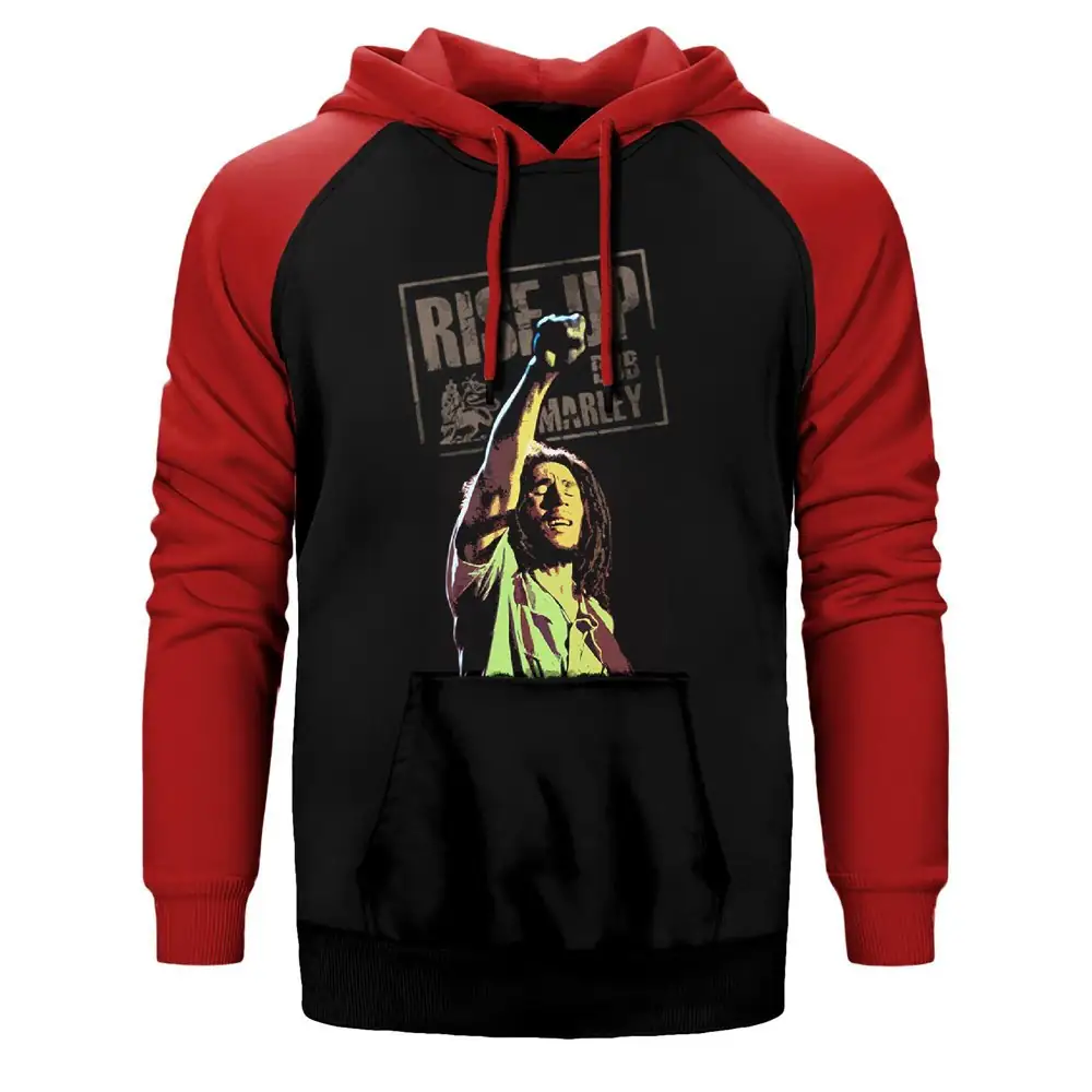 Bob Marley Rise Up Hoodie, Double Color Raglan Sleeve Red Sweatshirt