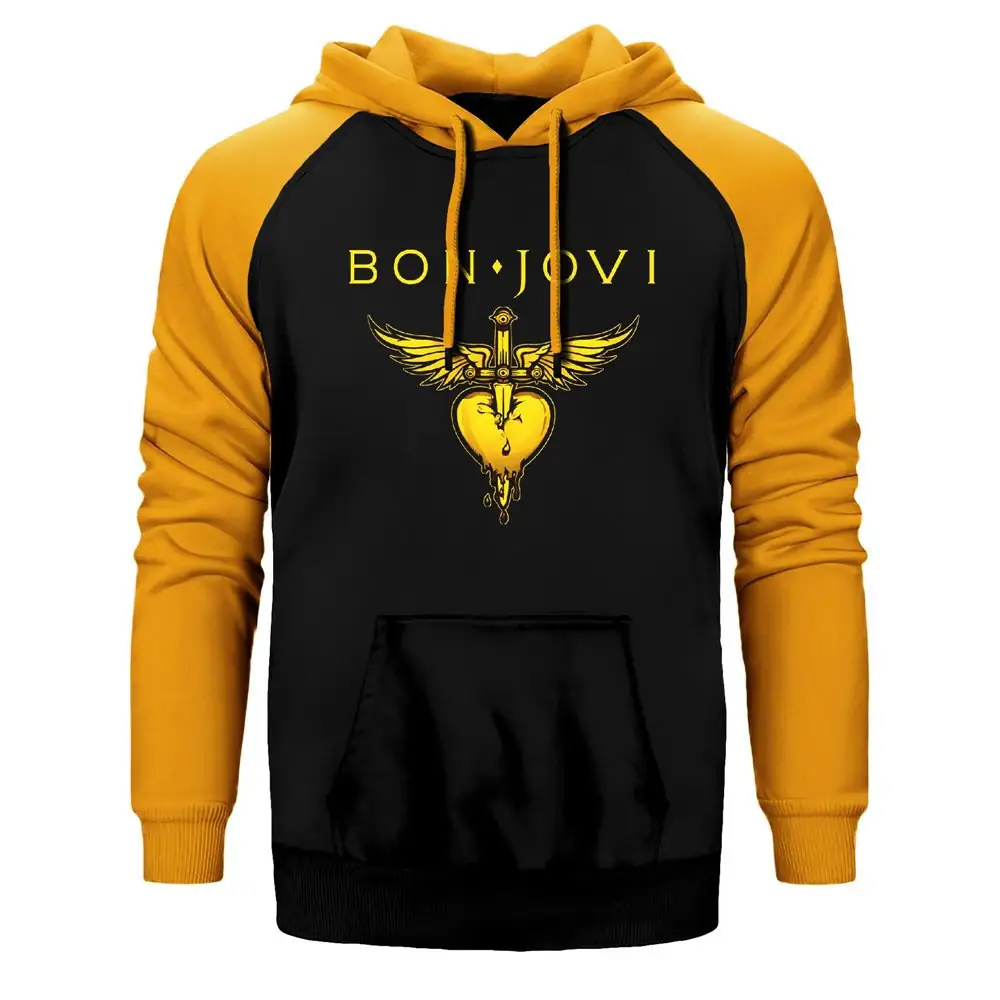 Bon Jovi Gold Hearth Hoodie, Double Color Raglan Sleeve Yellow Sweatshirt