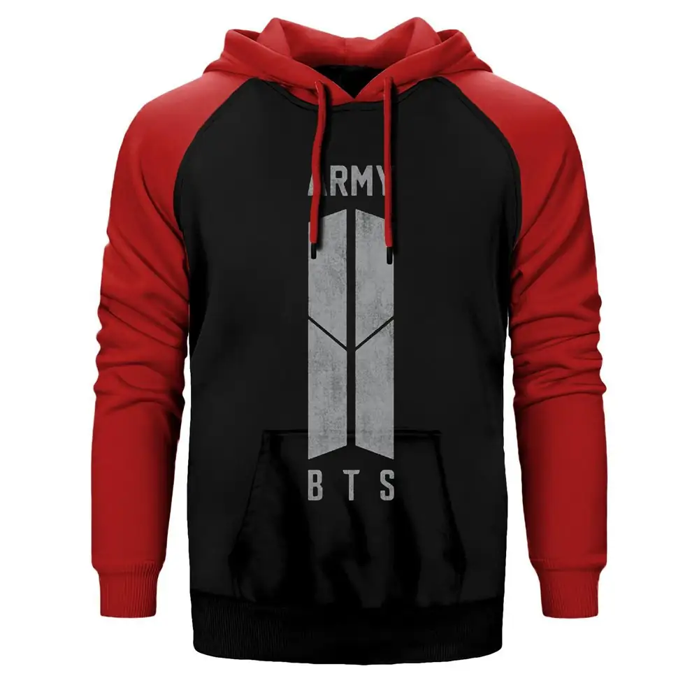 BTS ARMY Logo Hoodie, Double Color Raglan Sleeve Red Sweatshirt