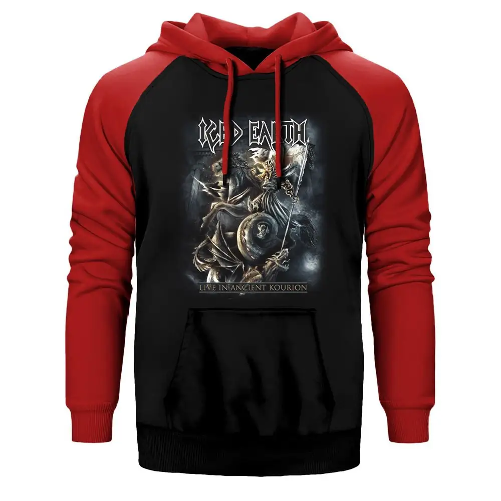 Ice Earth Hoodie, Double Color Raglan Sleeve Red Sweatshirt