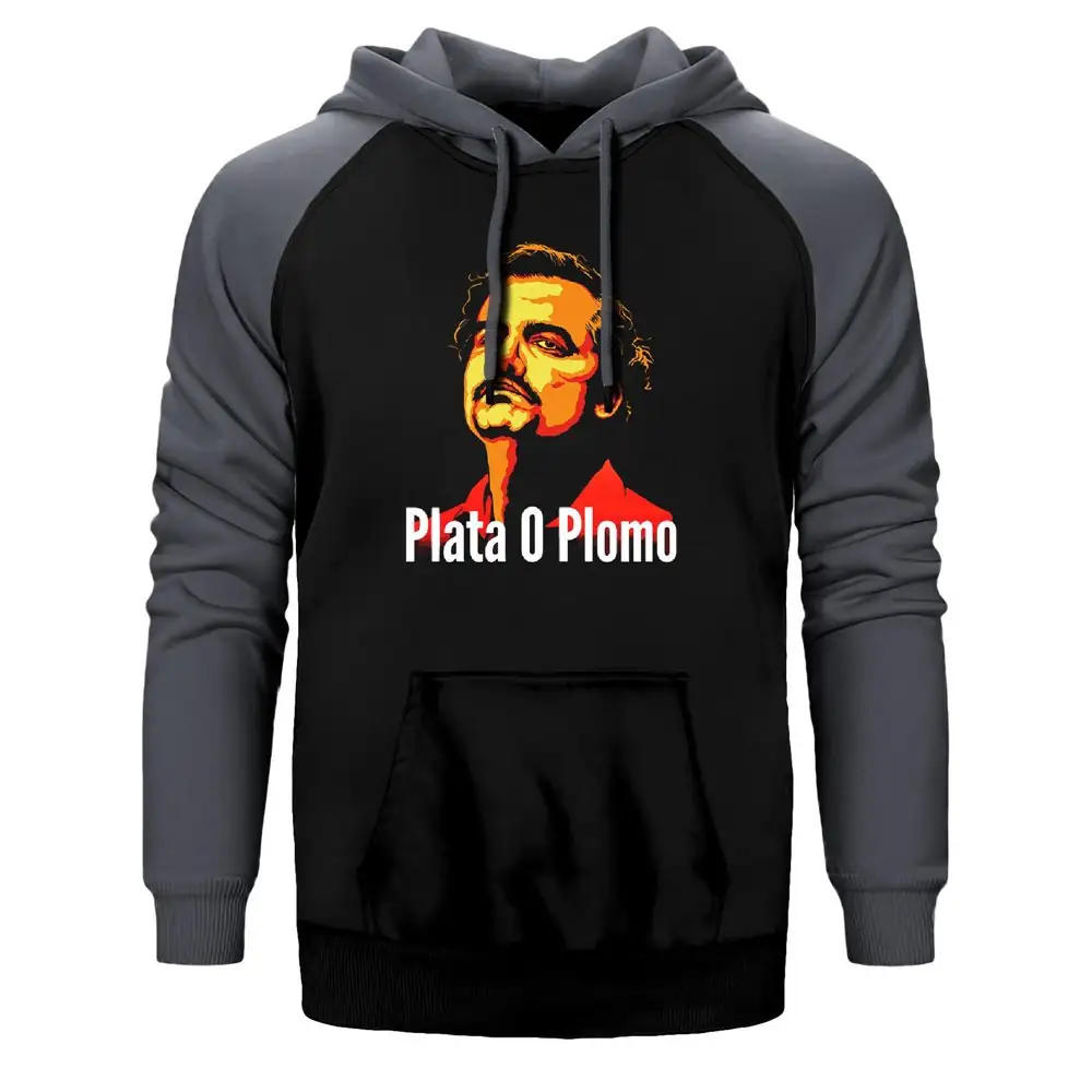 Narcos Plata O Plomo Hoodie, Double Color Raglan Sleeve Gray Sweatshirt