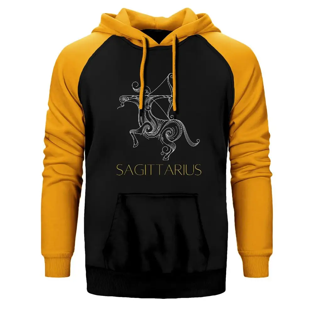 Sagittarius Zodiac Retro Hoodie, Double Color Raglan Sleeve Yellow Sweatshirt
