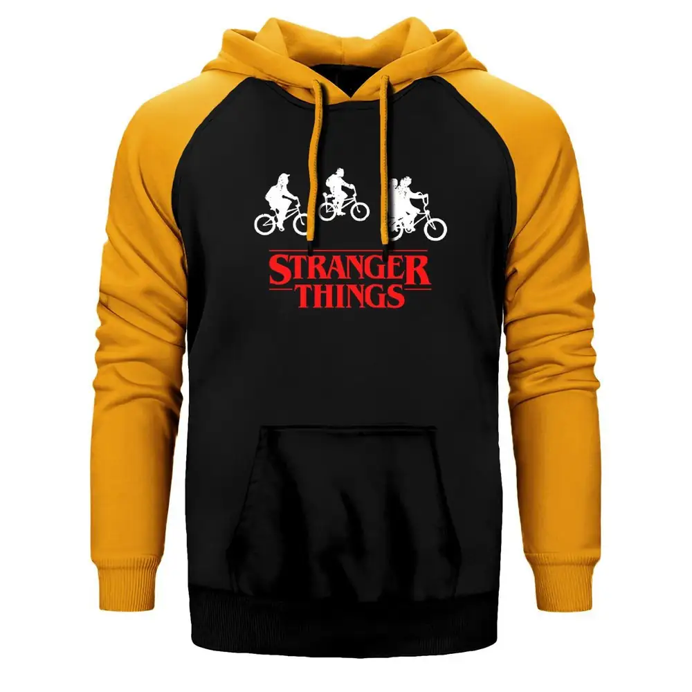 Stranger Things Bicycle Hoodie, Double Color Raglan Sleeve Yellow Sweatshirt